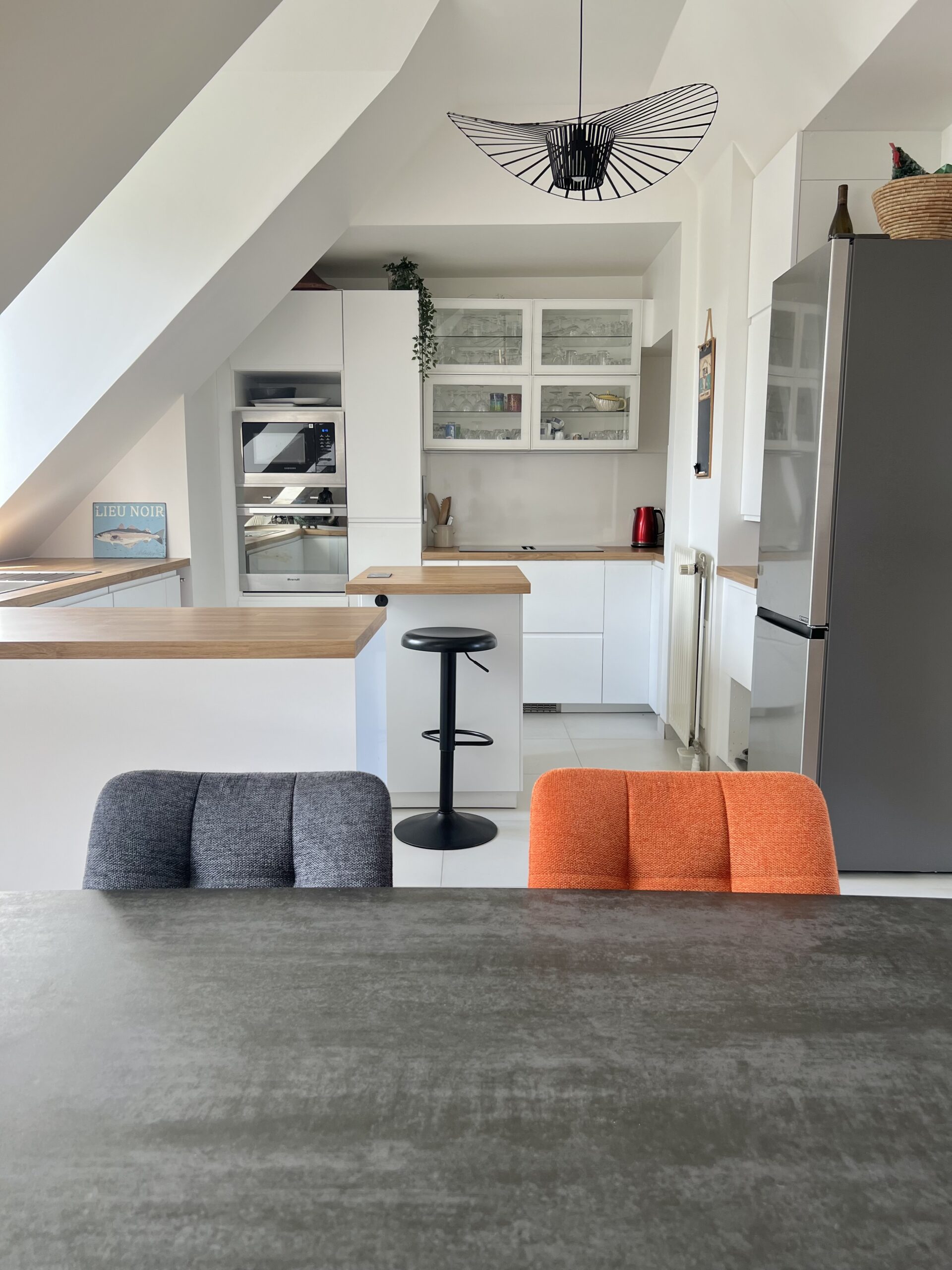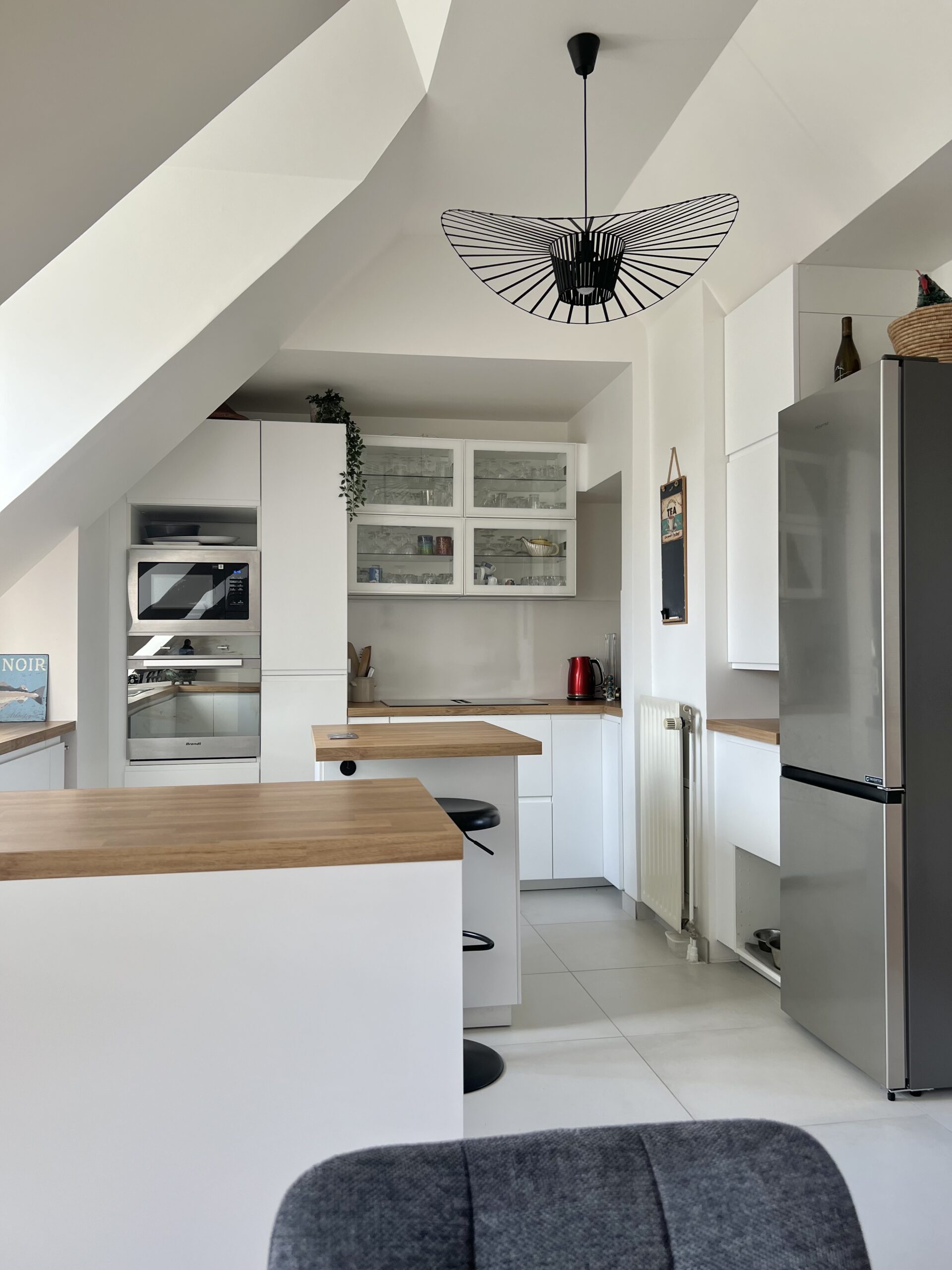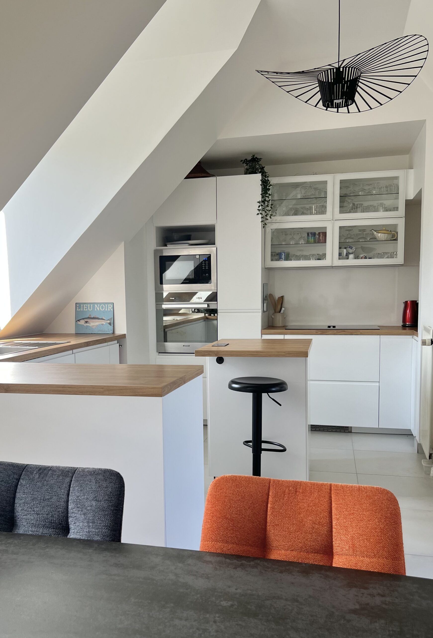 La nouvelle cuisine ouverte et lumineuse s’harmonise parfaitement avec le reste de l’appartement, l’association du blanc et du bois apporte douceur et élégance, tandis que la redistribution des rangements et des plans de travail offre un espace beaucoup plus fonctionnel et convivial.