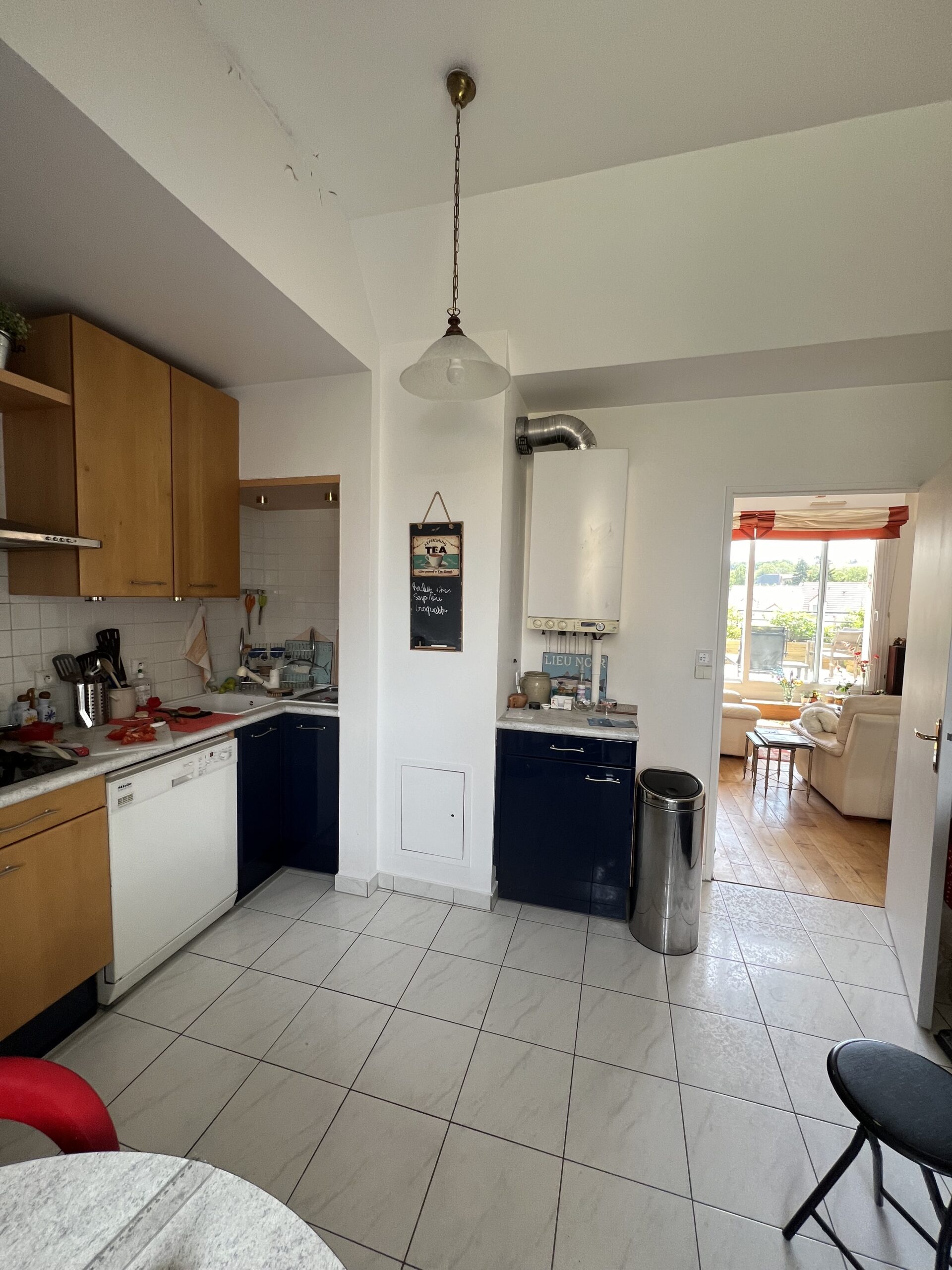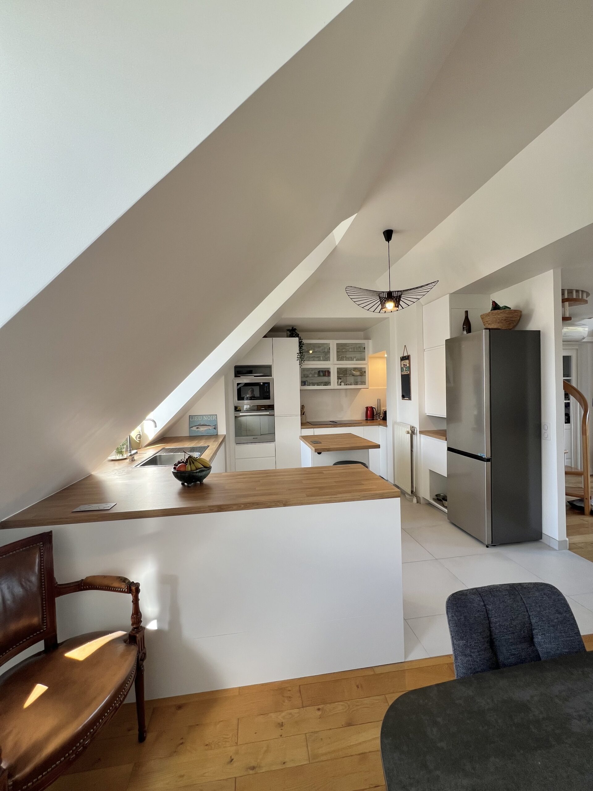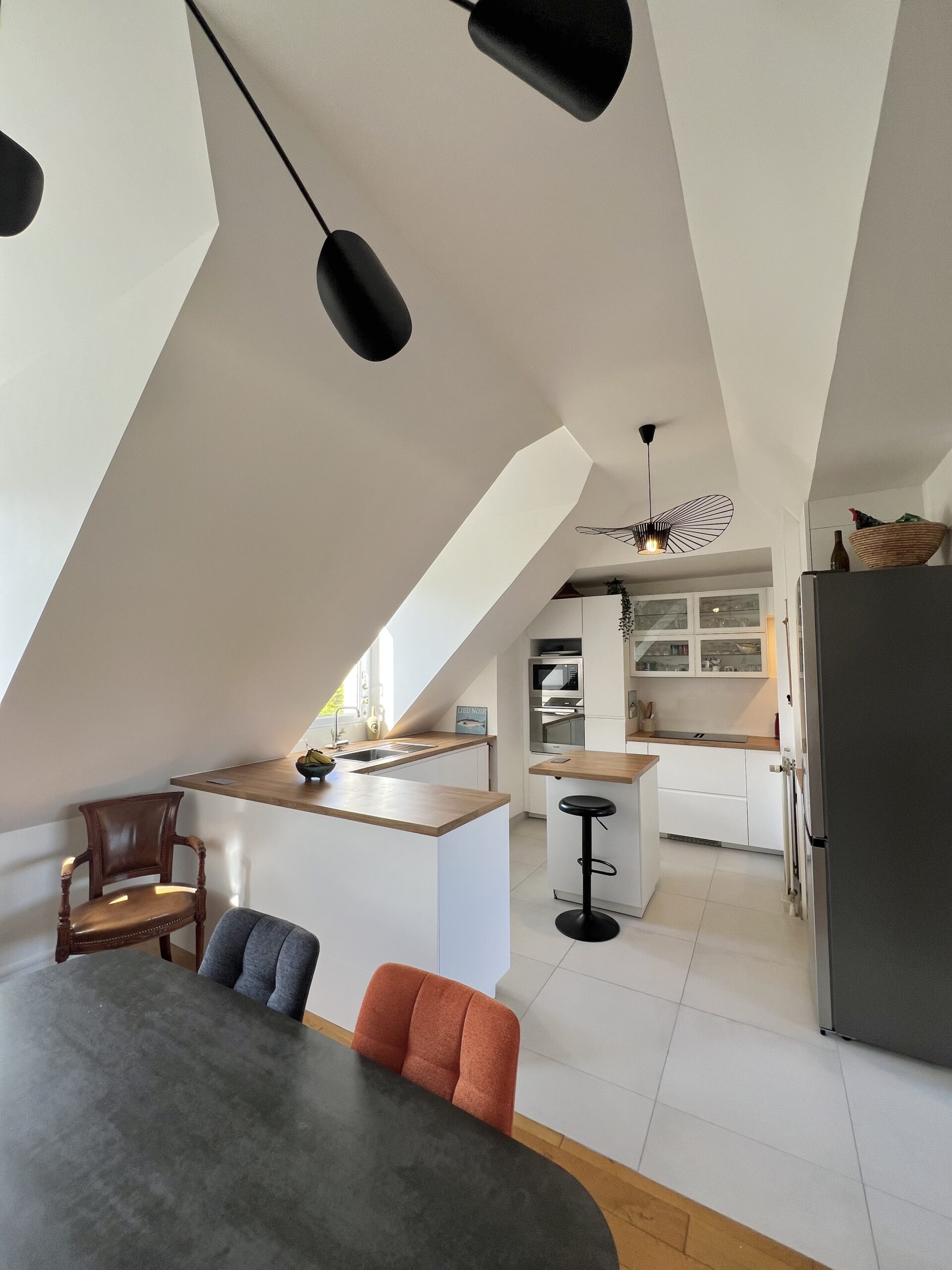 La nouvelle cuisine ouverte et lumineuse s’harmonise parfaitement avec le reste de l’appartement, l’association du blanc et du bois apporte douceur et élégance, tandis que la redistribution des rangements et des plans de travail offre un espace beaucoup plus fonctionnel et convivial.