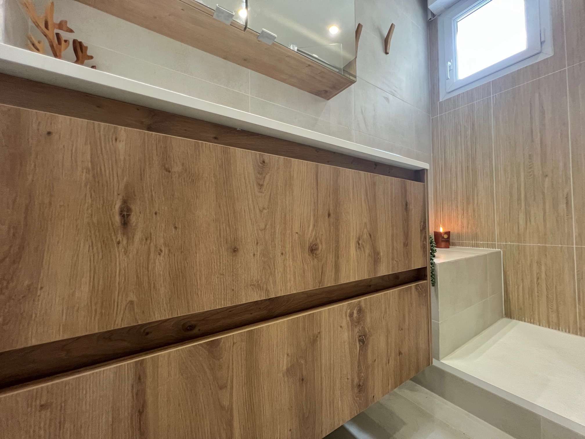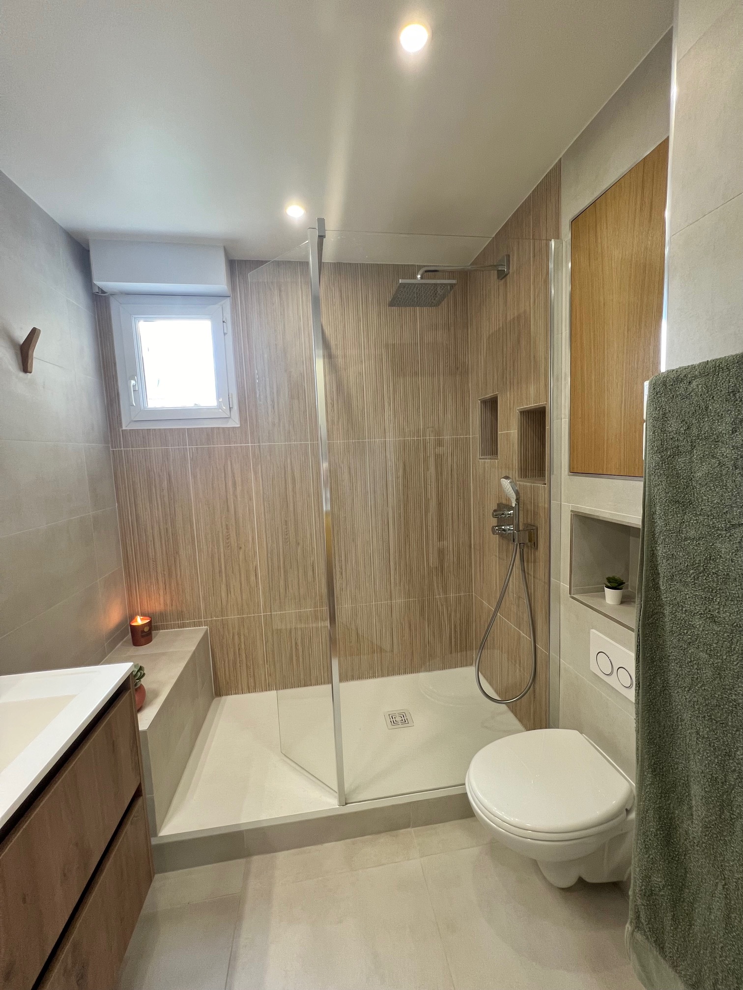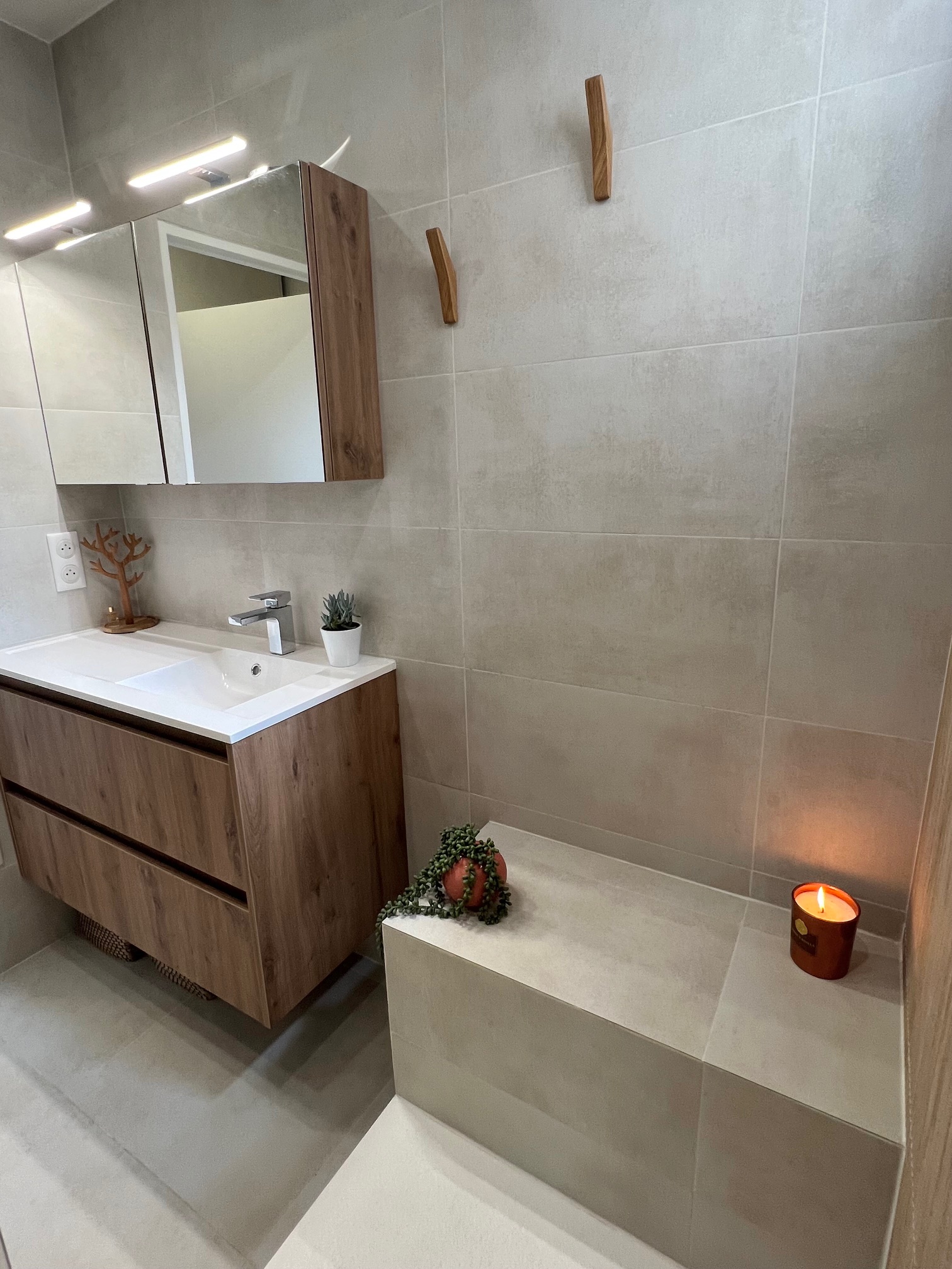 La douche, auparavant fermée et étroite, a été remplacée par une large douche à l’italienne ouverte, habillée d’un carrelage texturé effet bois vertical. Ce choix de matériaux apporte chaleur et verticalité, tout en créant une continuité visuelle élégante, les niches intégrées offrent un rangement discret et pratique. Les murs ont été revêtus de grès cérame grand format dans des tons beige clair, afin d’agrandir visuellement l’espace et de renforcer la luminosité naturelle, le sol, coordonné, unifie l’ensemble de la pièce pour un rendu épuré et cohérent, le meuble suspendu en finition bois, aux lignes minimalistes apporte une touche naturelle qui dialogue harmonieusement avec les parois de la douche.
