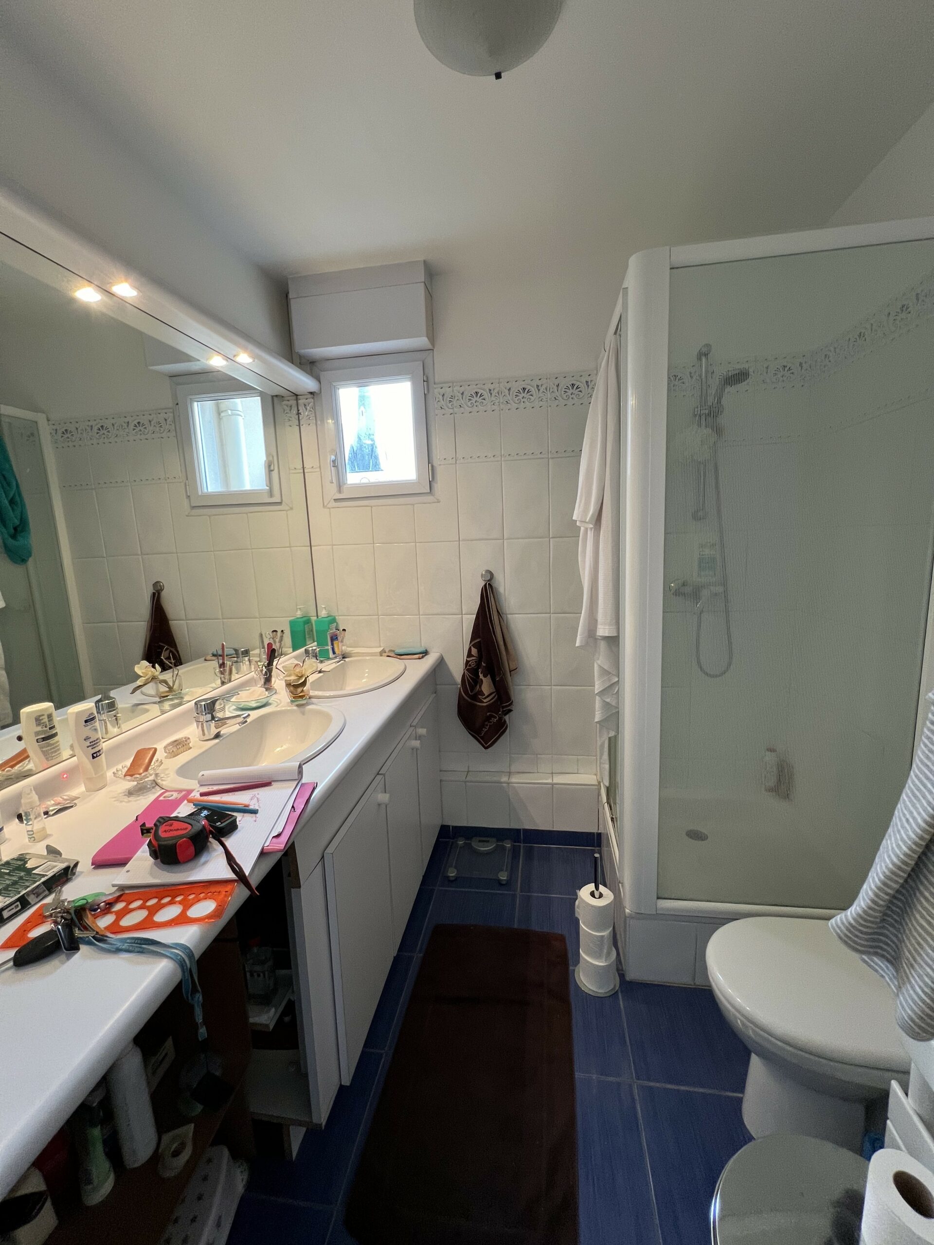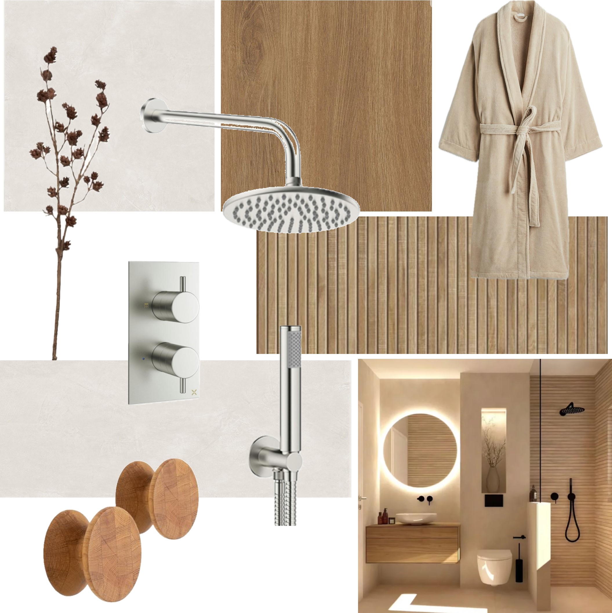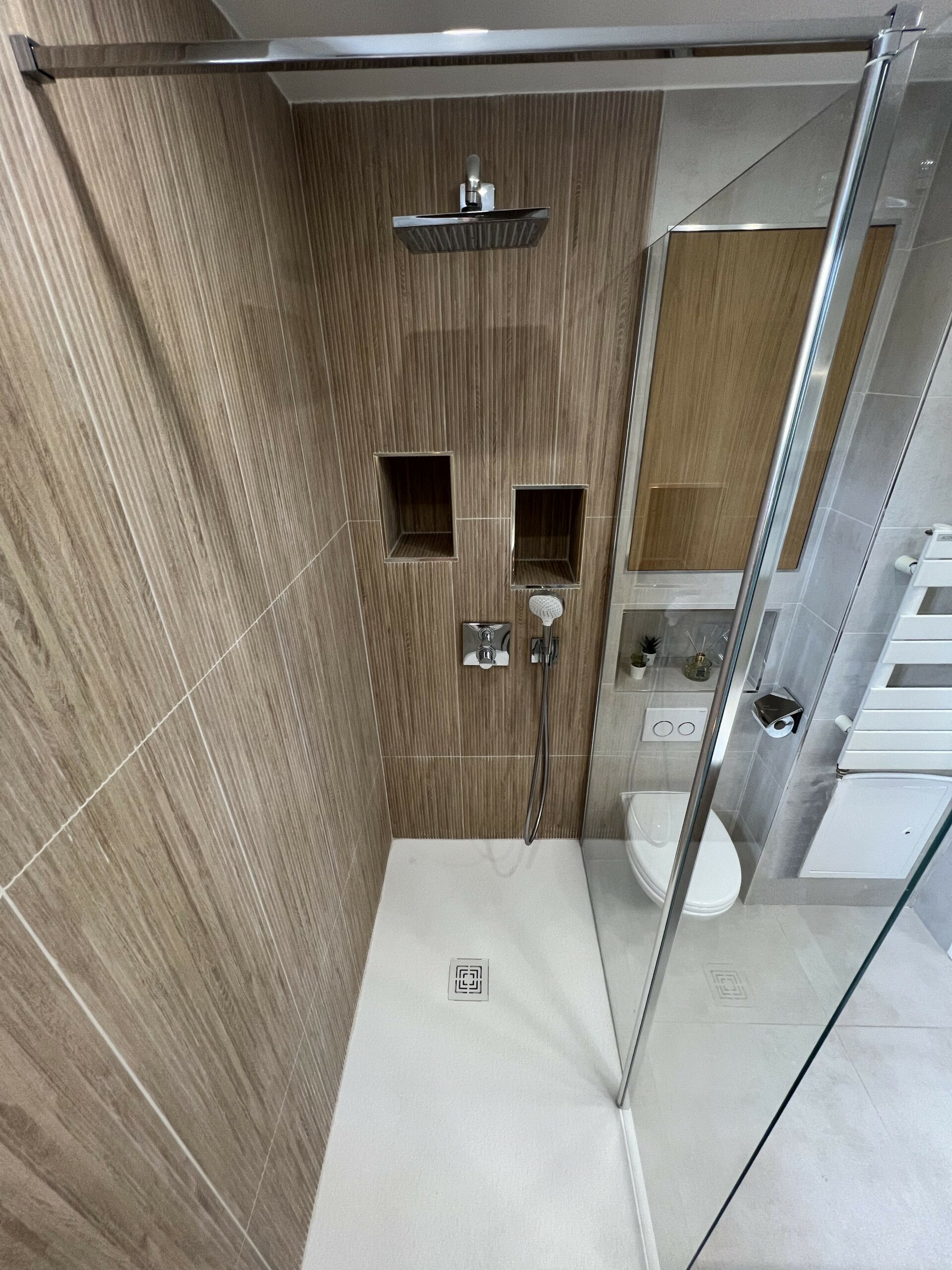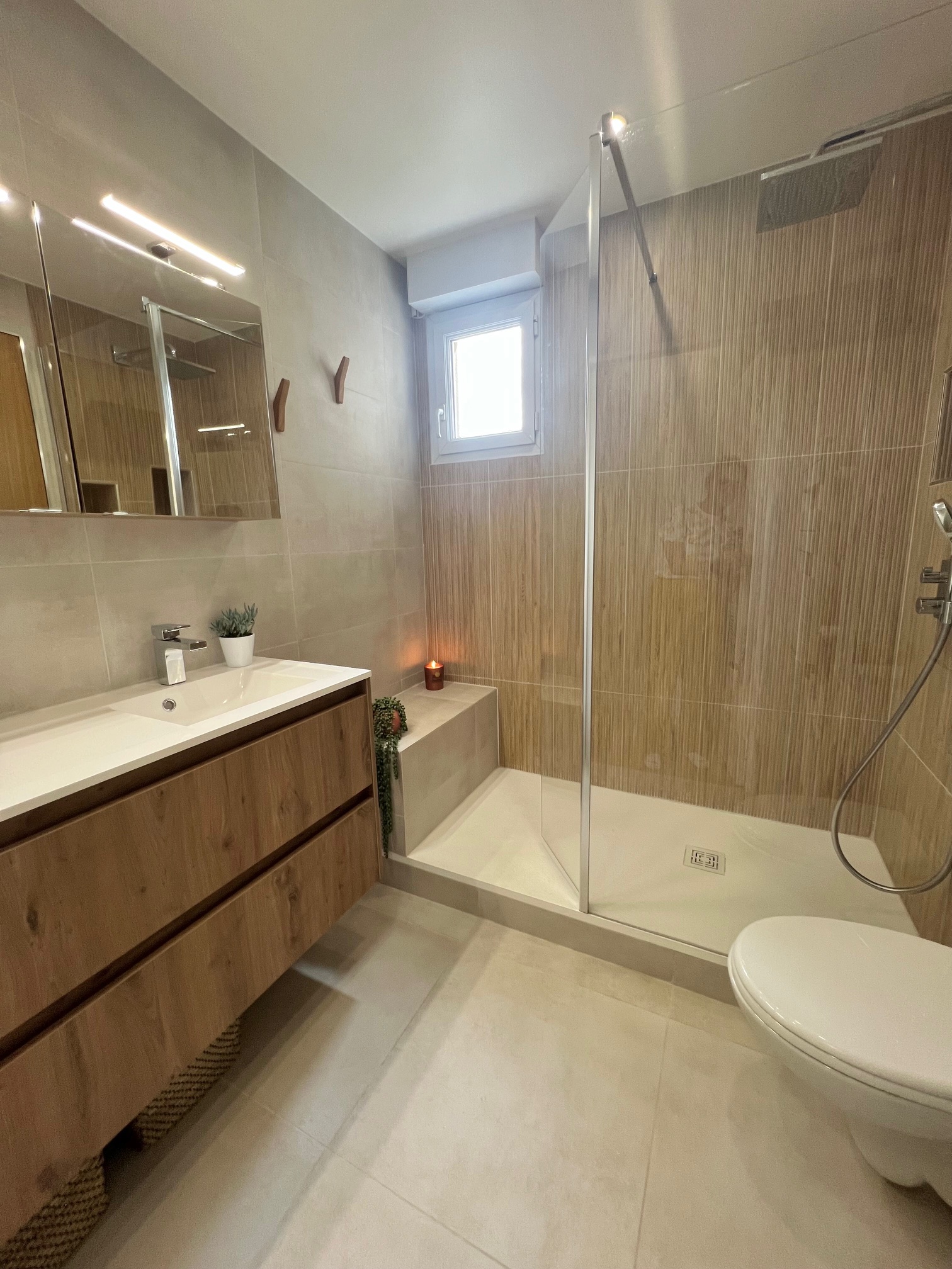 La douche, auparavant fermée et étroite, a été remplacée par une large douche à l’italienne ouverte, habillée d’un carrelage texturé effet bois vertical. Ce choix de matériaux apporte chaleur et verticalité, tout en créant une continuité visuelle élégante, les niches intégrées offrent un rangement discret et pratique. Les murs ont été revêtus de grès cérame grand format dans des tons beige clair, afin d’agrandir visuellement l’espace et de renforcer la luminosité naturelle, le sol, coordonné, unifie l’ensemble de la pièce pour un rendu épuré et cohérent, le meuble suspendu en finition bois, aux lignes minimalistes apporte une touche naturelle qui dialogue harmonieusement avec les parois de la douche.