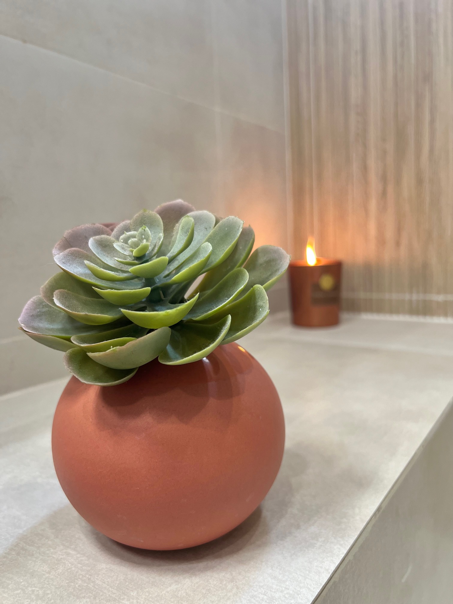 Comme la salle de douche cette salle de bain était vieillissante et très marquée par des choix décoratif et de mobilier qui n’étaient plus adaptés au style d’aujourd’hui ni au gout de la cliente. Ici l’envie était d’amener une expérience de bien-être dans un espace apaisant.